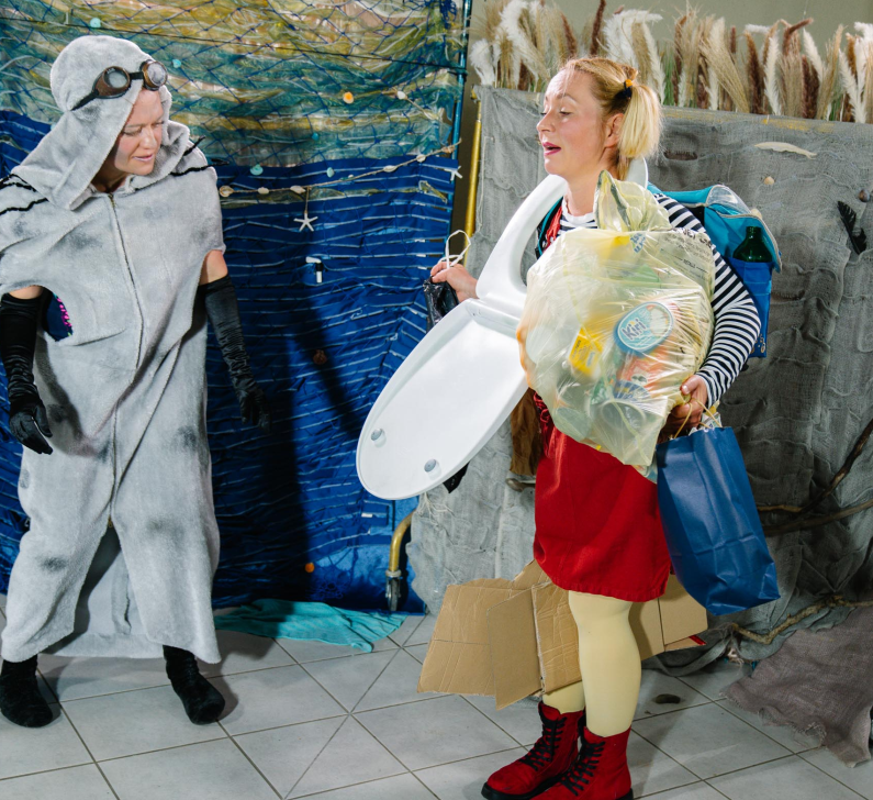 Dann kommt Mia und wirft achtlos die Folie ihres Fischbrötchens an den Strand. Aber wie soll Finn denn am Strand vorwärts kommen zwischen den ganzen Folien, Plastikflaschen und Chipstüten? Woher kommt überhaupt dieser ganze Müll? Und wie räumt man ihn richtig weg, damit er nicht woanders wieder auftaucht?